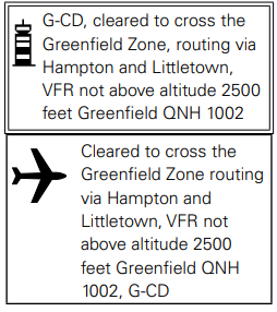 PILOT: “Cleared to cross the London Control Zone, routeing Bracknell direct Fairoaks, not above altitude 1,200 feet, VFR, G-CD”