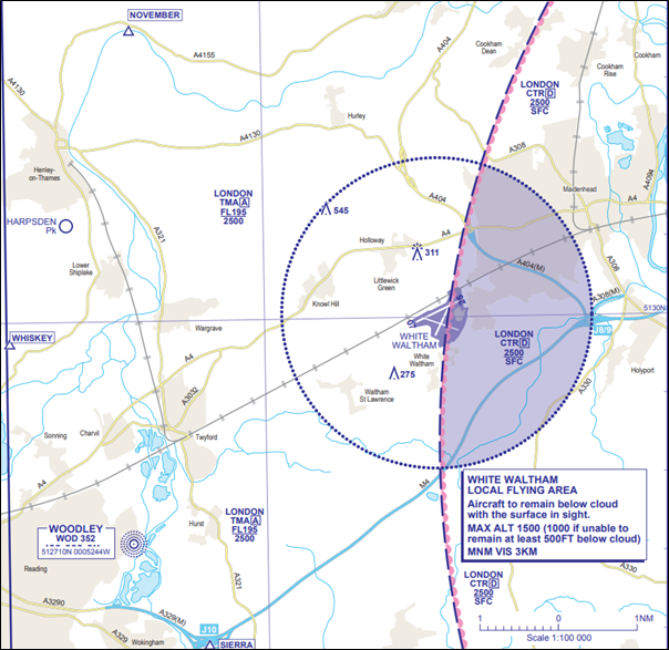 White Waltham aerodrome sits partly within the London CTR and has an ATZ of 2NM radius extending from the surface to an upper limit of 2,000 above, or 2,127 feet AMSL. As a portion of this ATZ sits within the London CTR, a Letter of Agreement (LoA) is established between the air navigation service provider and the aerodrome to allow aircraft to operate within the portion of the ATZ that lies within the CTR as long as specified conditions are complied with. These conditions are listed in UK AIP AD 2 EGLM WHITE WALTHAM AD 2.22 FLIGHT PROCEDURES (see Figure 1 below). Flights must not leave the ATZ when within the London CTR unless in receipt of an individual clearance from Heathrow Radar.