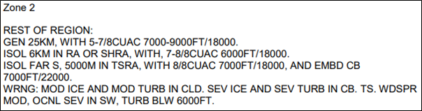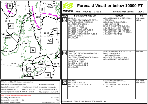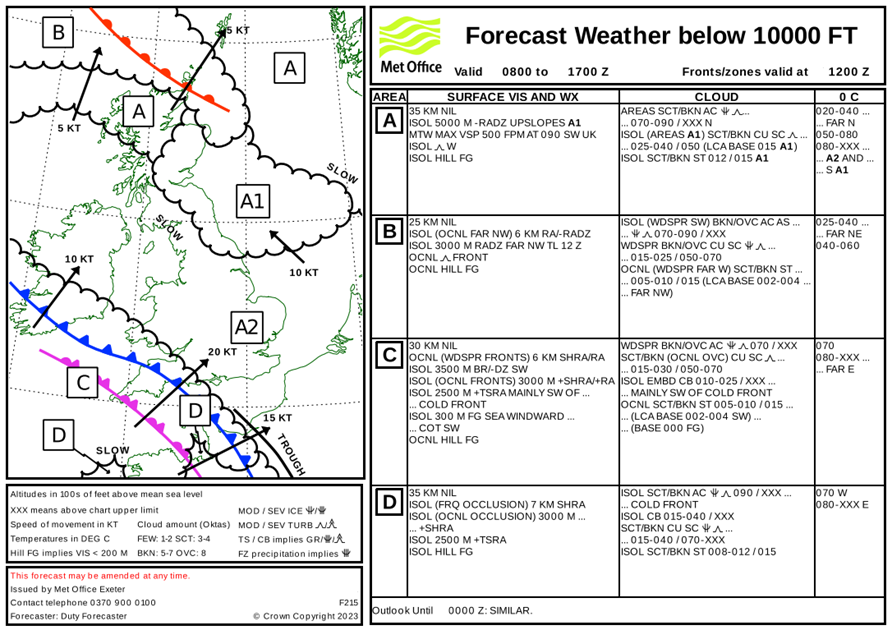 Figure 3: Excerpt from the Met Forms F215 Forecast Weather below 10000 FT valid at the time of the occurrence and published at 0300 UTC on the day of the flight. © Crown Copyright 2024