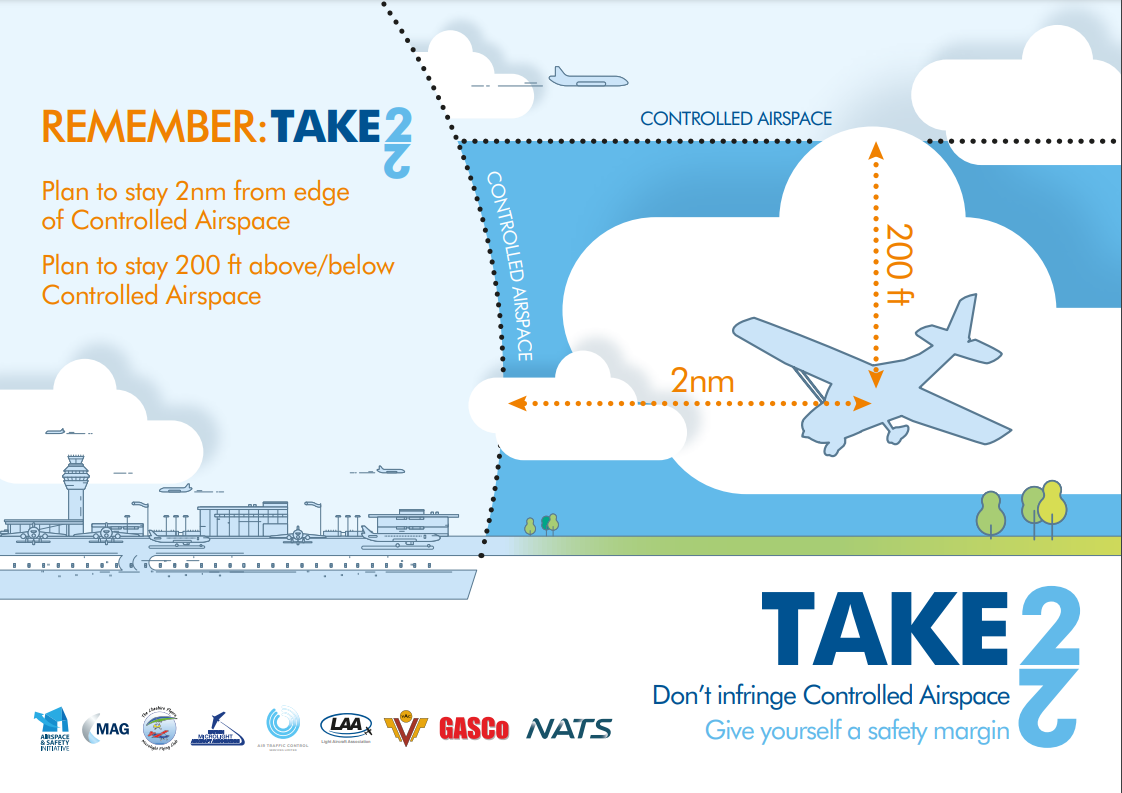 The planned route did not incorporate the CAA ‘Take 2’ guidance where pilots are encouraged to, where able, plan to remain at least 2NM from the edge or 200 feet below the base of subject airspace to avoid airspace infringements. It is recognised that departing from an aerodrome like White Waltham, within a CTR, it is not possible to comply with ‘Take 2’ immediately after departure. However, consideration should be given to the ‘Take 2’ concept once leaving the confines of a CTR/LFA with the risk of an airspace infringement identified during the planning of a departure.