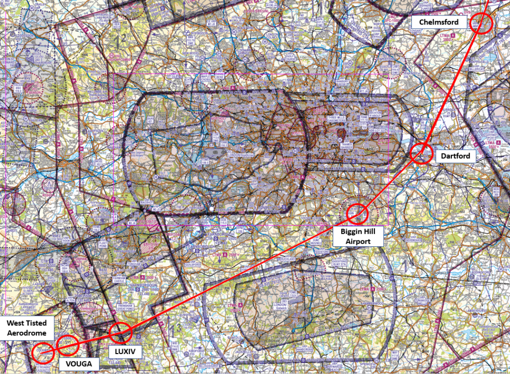 Figure 3: Approximate track of the aircraft after departure from White Waltham represented on the CAA-NATS 1:250,000 Southern England chart (Edition 28).